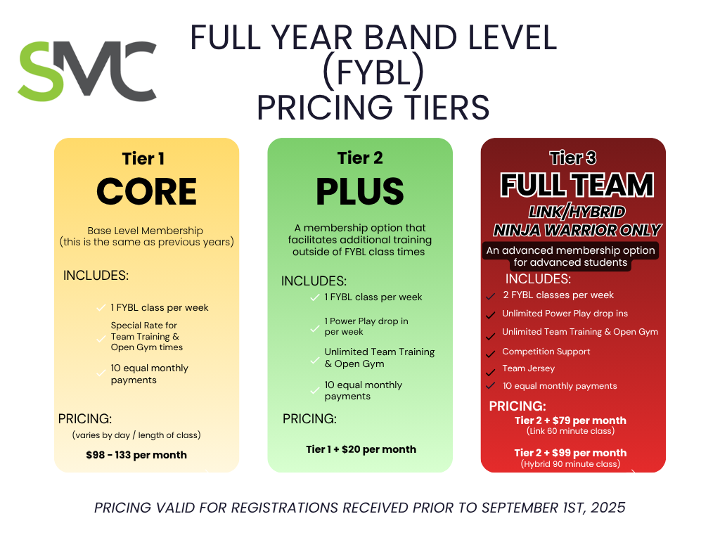 To determine which band level they should be working toward, the students interested in this program will test their skill level in an Assessment. This will help ensure that they are placed in a class that is appropriate for where they are in their parkour progression. These sessions are an hour long, and will take place before every new registration period.