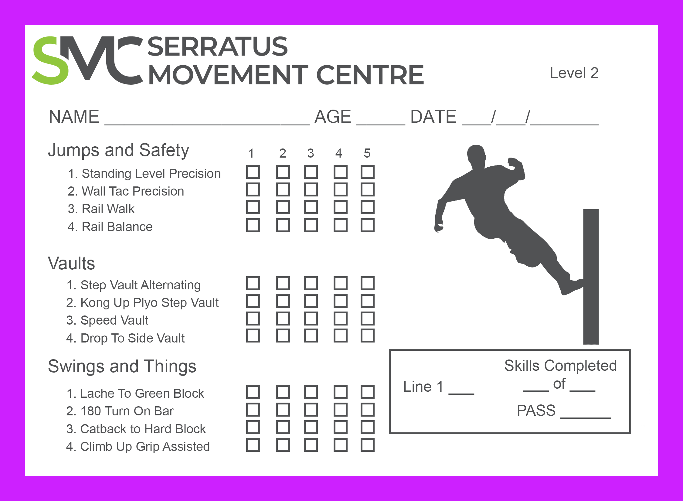 Students working toward their Level 3 (YELLOW BAND) will be fully confident with all of the basics and will be starting to learn more advanced parkour movements and introducing skills on rails as well as controlling timing and speed.